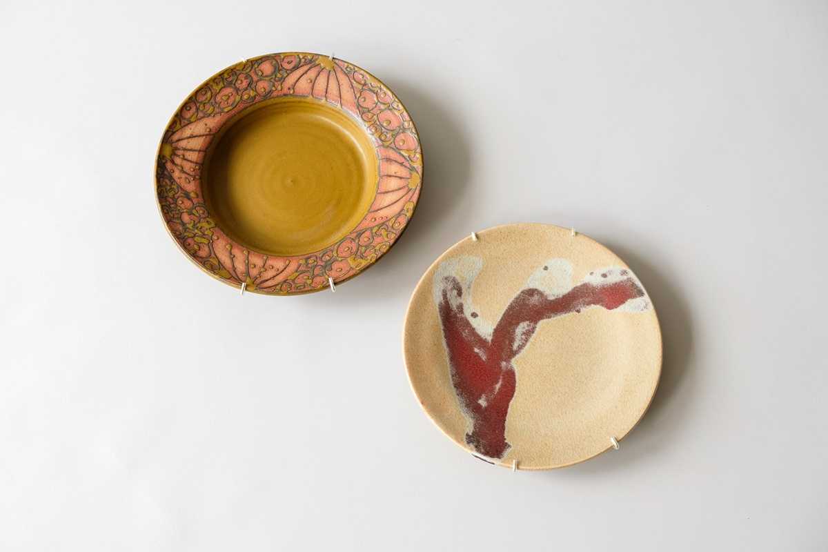 Set of 2. Two ceramic decorative plates. Includes wall mounts. Dimensions of largest plate below.
