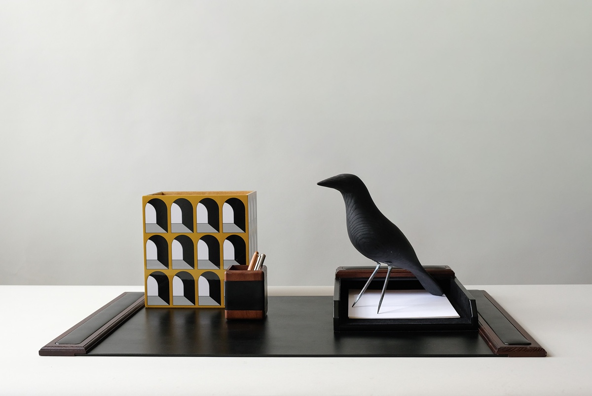 Set of 7. Decorative wooden crow, arches trash can, pen holder with two pens, desk blotter, and paper tray. For scale, the dimensions of the...