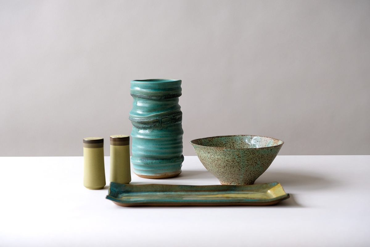 Set of 5. Ceramic vase and bowl, ceramic tray, salt & pepper shakers. For scale, dimensions of the vase are below.