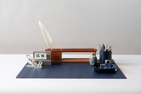 Set of 10. Blotter, leather catch-all, pen holder, 2x acrylic shapes, clover paper weight, metal tape dispenser, Japanese style organizer, w...