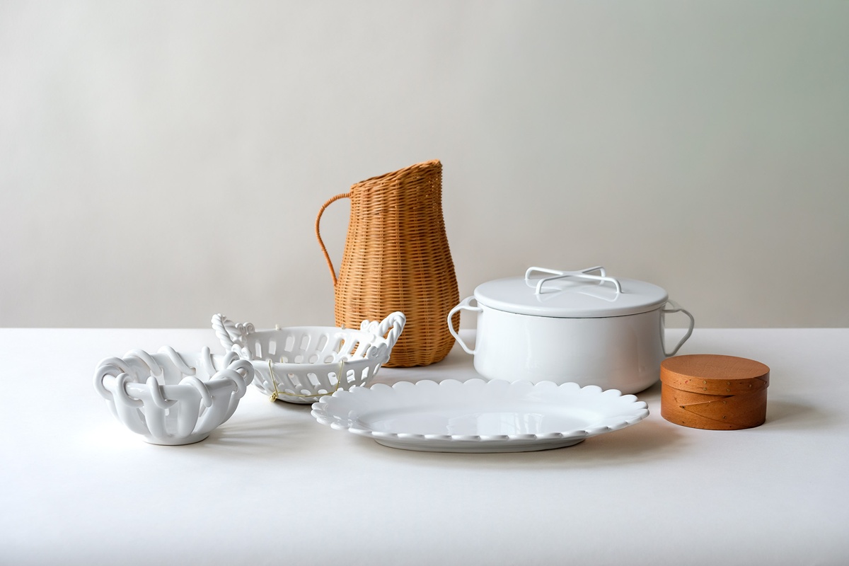 Set of 6. Dansk enamel casserole with lid, wicker vase, shaker wood box, 3x Bourg-Joly Malicorne ceramic pieces, one with optional wall moun...