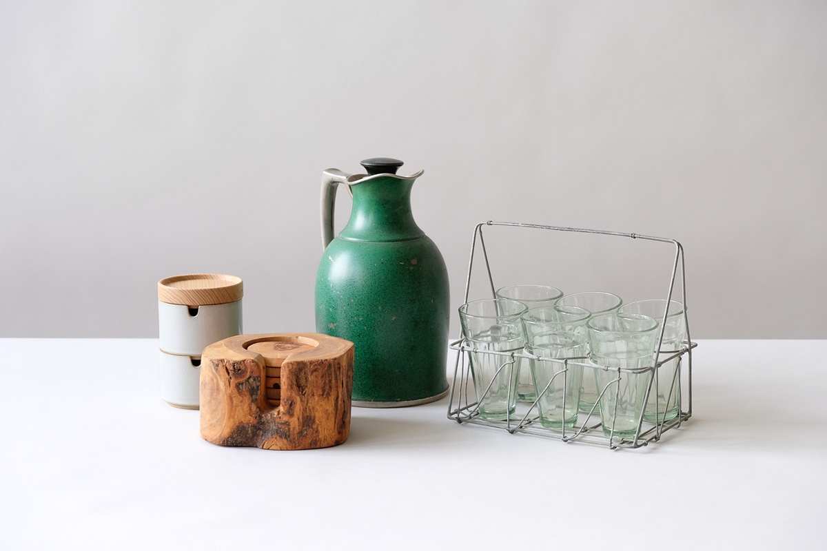 Set of 4. Green metal kettle, stacking Hasami sugar dishes, wood coaster set, and set of 6 small glasses and caddy. For scale, dimensions ar...