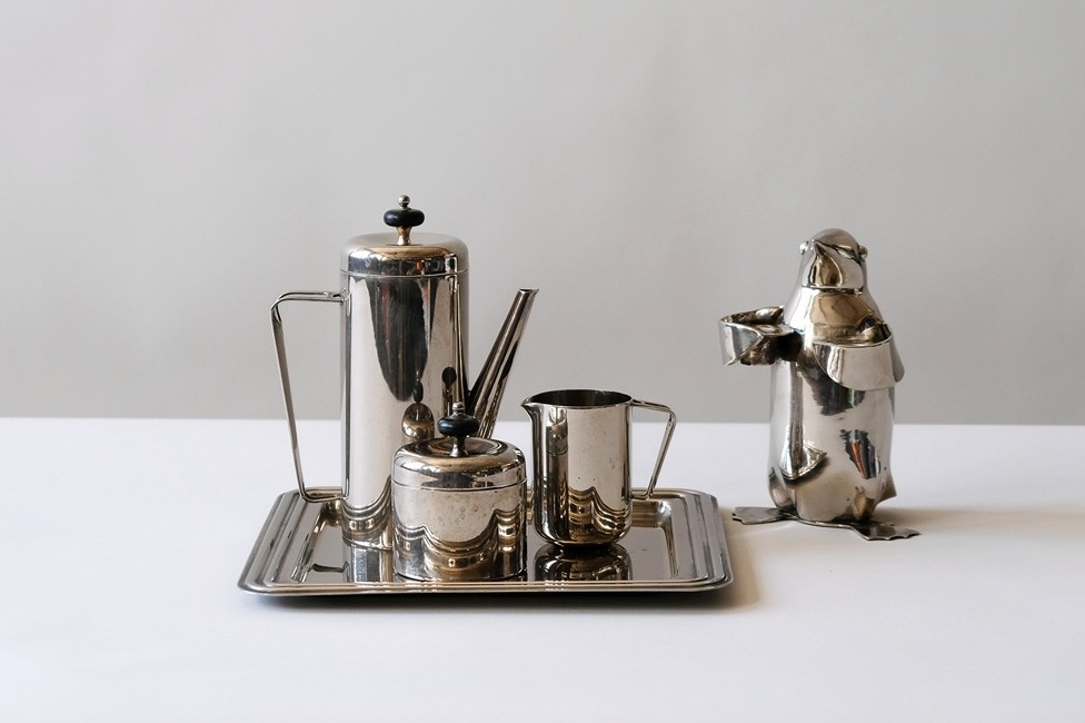 Set of 6. Silver coffee carafe, sugar dish, creamer, tray, glass decanter, and penguin candle holder. Light scuffs and smudges. Dimensions b...